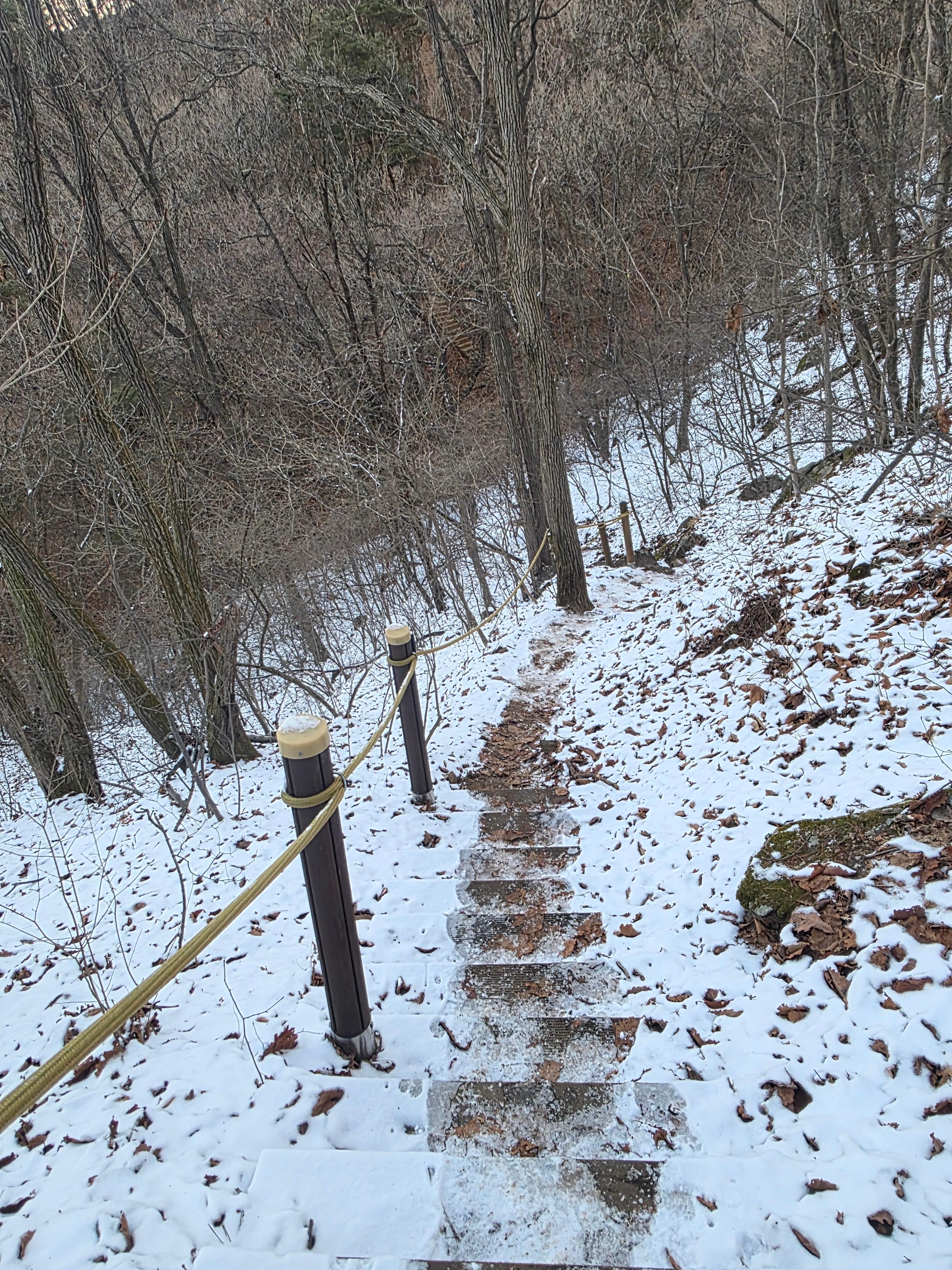 그 길을 따라 올라갔다. 아직 눈이 있었다. 눈이 얼어서 길이 살짝 미끄러웠다.